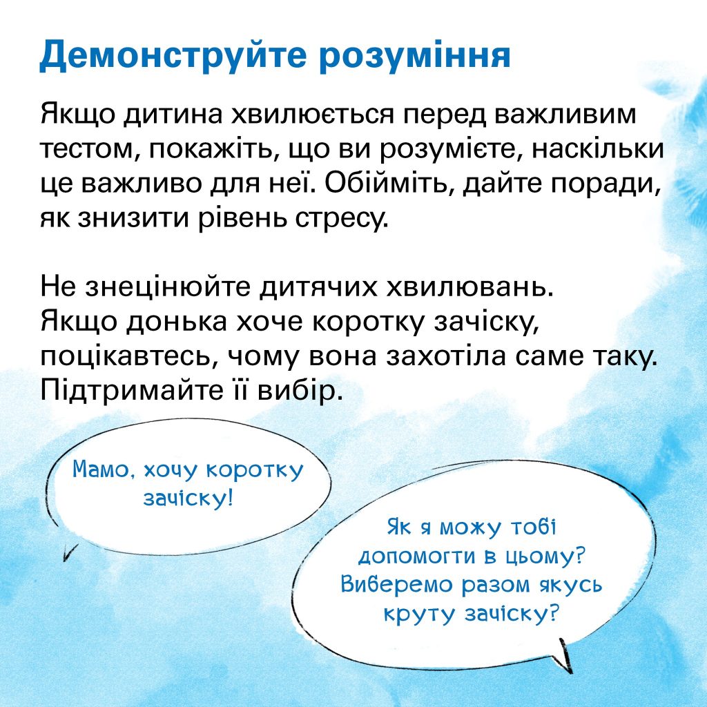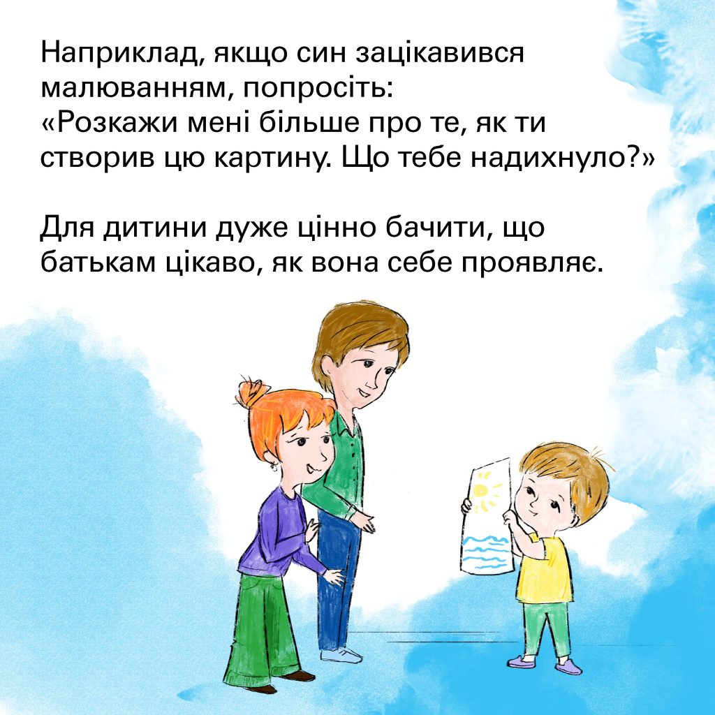 Допомога – кожного дня діти звертаються до вас із різноманітними запитаннями, проханнями. Завдання батьків – почути їх і відповісти. Якщо ми допомагаємо дитині й робимо це з радістю, то душа її наповнюється любов’ю.